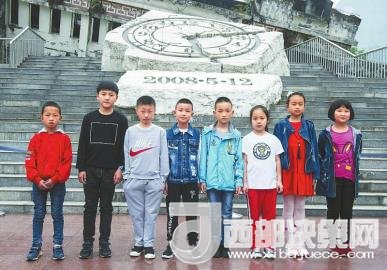 2018年5月1日,8個孩子站在汶川縣映秀鎮(zhèn)漩口中學(xué)遺址前,拍下了一張合影。