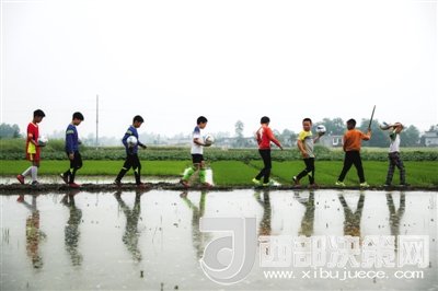 4月21日,四川省綿陽市迎新鄉(xiāng)小學(xué)足球隊的隊員們走在鄉(xiāng)間的田埂上,周末即使沒有訓(xùn)練,他們也會約著一起玩球。