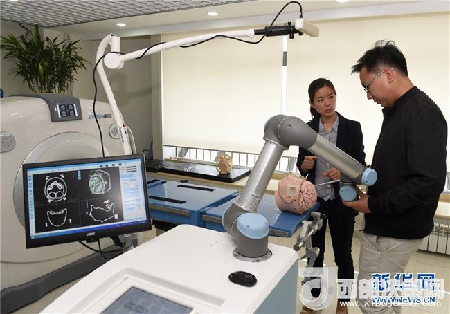 北京柏惠維康公司的工作人員在調試神經外科手術機器人(2018年5月10日攝)。北京柏惠維康公司研制的神經外科手術機器人在行業(yè)內占據領先地位。 新華社記者羅曉光攝