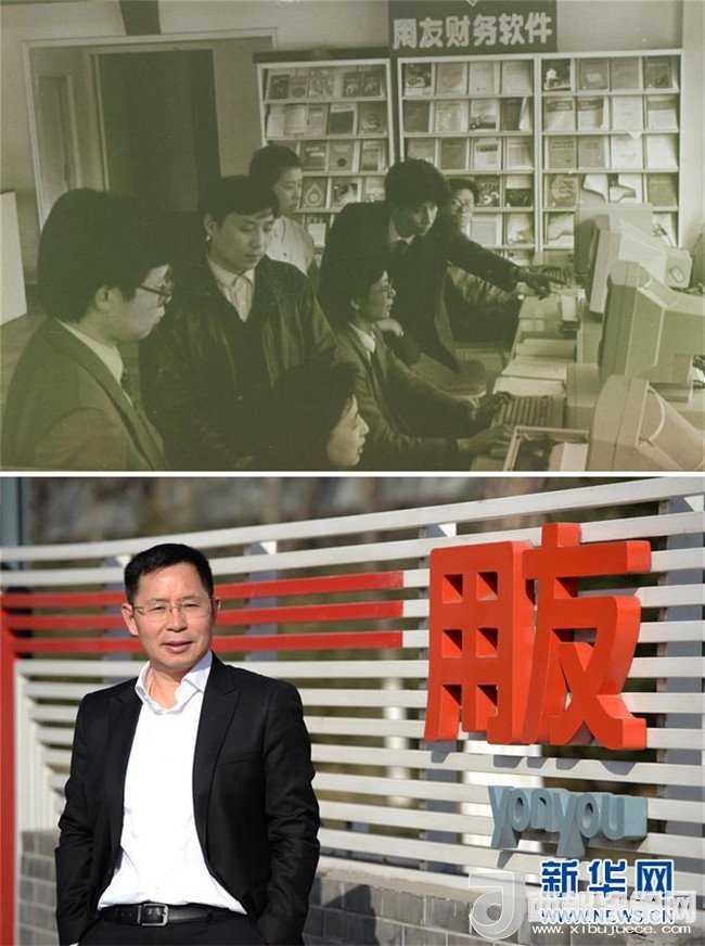 拼版照片:上圖為1989年的用友;下圖為用友網絡董事長兼CEO王文京(資料照片)。用友是中關村第一個拿到私營高新技術企業(yè)牌照的企業(yè),編號“SY0001”。從創(chuàng)業(yè)時2個人的軟件服務社,到30年后的1.5萬人,用友正從管理軟件公司向為企業(yè)“賦能”的知名云服務企業(yè)邁進。新華社發(fā)