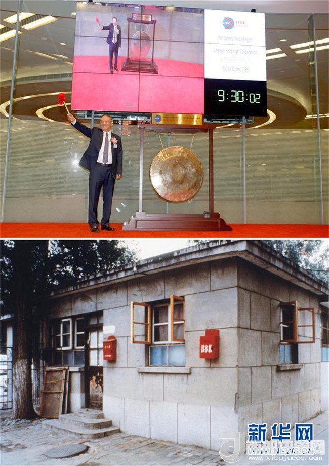 拼版照片:上圖為2015年6月29日,聯想控股在香港整體上市,聯想控股董事長、聯想集團創(chuàng)始人柳傳志敲鐘;下圖為1984年,柳傳志等11位科研人員在一間不足20平方米的小平房(中科院計算所傳達室)中創(chuàng)辦了聯想。 新華社發(fā)