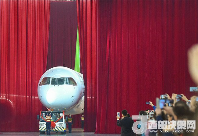 我國自主研制的C919大型客機首架機,在中國商飛公司總裝制造中心浦東基地廠房內正式下線(2015年11月2日攝)。新華社發(fā)(裴鑫 攝)