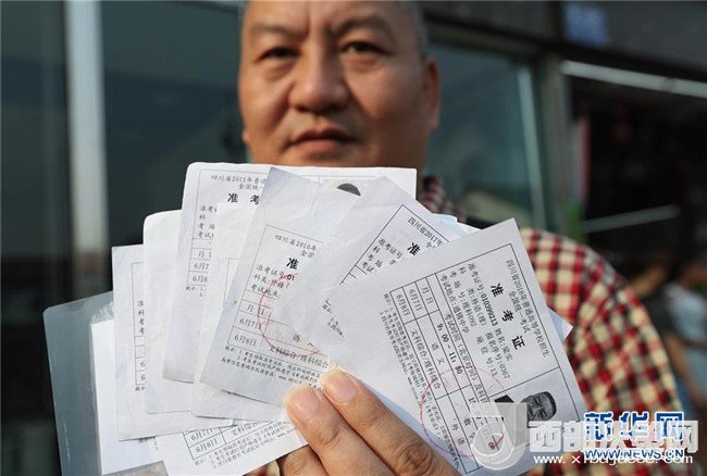 6月7日,梁實(shí)在展示歷年參加高考的部分準(zhǔn)考證。新華社記者 江宏景攝