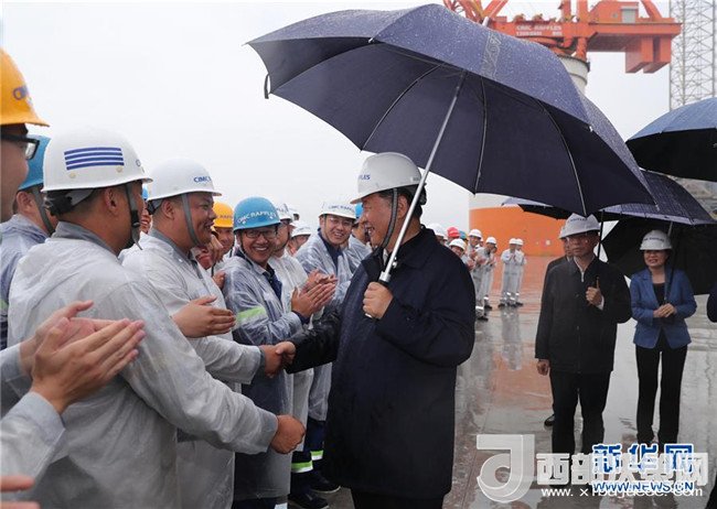 風急云低,雨流如注。13日下午,習近平來到中集來福士海洋工程有限公司煙臺基地。作為國內率先進入海洋工程行業(yè)的企業(yè),中集來福士用10年左右時間,國產化率從不足10%提高到60%。在廠區(qū)碼頭上,習近平撐著雨傘,趟著積水,近距離察看??吭谶@里的自升式修井生活平臺,遠眺“藍鯨1號”超深水雙鉆塔半潛式鉆井平臺、“泰山”龍門吊、海洋牧場平臺,向企業(yè)負責人詳細了解高端海洋工程設備制造、維護、運行情況。海風吹起了衣襟,雨水打濕了褲腿。習近平站在雨中,同圍攏過來的工人們一一握手、親切交談,向作業(yè)平臺上的工人們揮手致意。習近平指出,國有企業(yè)特別是中央所屬國有企業(yè),一定要加強自主創(chuàng)新能力,研發(fā)和掌握更多的國之重器。國有企業(yè)要深化改革創(chuàng)新,努力建成現(xiàn)代企業(yè)。要堅持黨對國有企業(yè)的領導不動搖,堅持建強國有企業(yè)基層黨組織不放松,為做強做優(yōu)做大國有企業(yè)提供堅強組織保證。