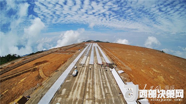“前期遇到的最大障礙就是土石方開挖和回填工程。”現(xiàn)場施工管理人員介紹,作為渝東北典型的高填方機場,巫山機場填筑體最高處達100余米,整個擬建場地相對高差約227.25米,道槽區(qū)最大填高達50米,施工過程中需處理的溶洞多達40處,施工難度極大。在土石方作業(yè)最忙時每天有近2000人和800多臺機具晝夜施工,土石方運輸車輛川流不息。