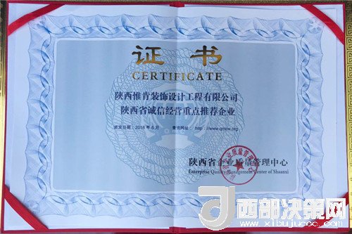 西部決策網(wǎng)——西部大開發(fā)訊(帥華鋒 張曉紅)近日,寶雞市惟肯裝飾榮獲陜西省企業(yè)質(zhì)量管理中心頒發(fā)《陜西省工程質(zhì)量AAA級信譽(yù)單位》和《陜西省誠信經(jīng)營重點推薦單位》兩項榮譽(yù)稱號。