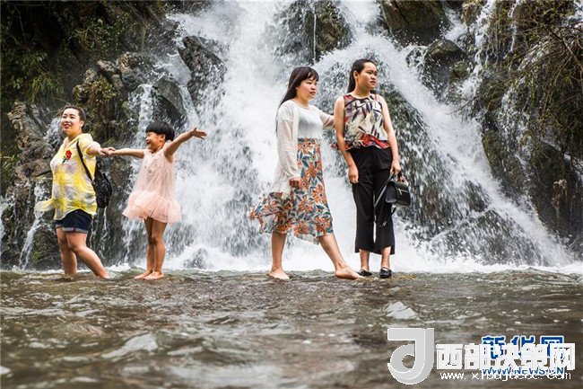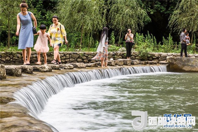7月11日,在貴州省大方縣黃泥塘鎮(zhèn)烏溪生態(tài)農(nóng)業(yè)避暑園,小朋友在水邊戲水。