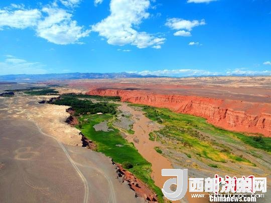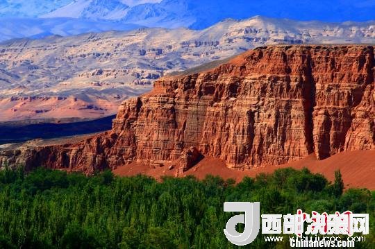 站在天山紅河谷入口處的斷崖邊,可以清晰地看到遠(yuǎn)處的天山,天然的紅土飄帶,一簇簇的綠蔭,坐落有致的農(nóng)家院落。荒涼的戈壁與斷崖下的美景,給人以強(qiáng)烈的視覺(jué)沖擊。紅色的山巖,猶如一條鑲嵌在天際間的飄帶而光彩奪目,河谷內(nèi)寧?kù)o的村莊透露著幾分神秘。