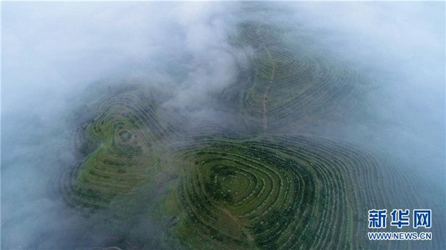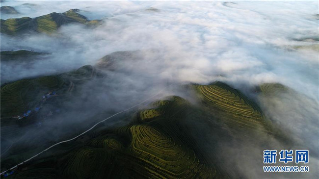 云霧繚繞的寧夏彭陽(yáng)縣金雞坪梯田公園(7月17日無人機(jī)拍攝)。新華社記者王鵬攝