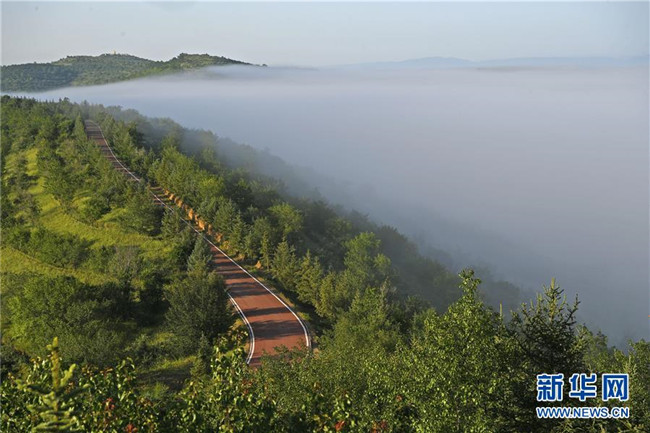 云霧繚繞的寧夏彭陽(yáng)縣金雞坪梯田公園(7月17日攝)。新華社記者王鵬攝