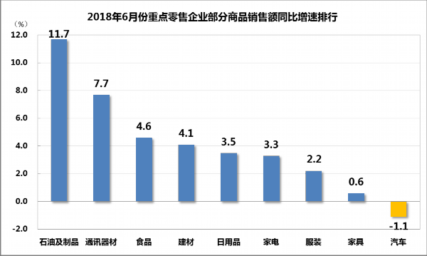 食品、日用品、服裝銷(xiāo)售額同比分別增長(zhǎng)4.6%、3.5%和2.2%,家電、建材、家具同比分別增長(zhǎng)3.3%、4.1%和0.6%,石油及制品同比增長(zhǎng)11.7%,通訊器材同比增長(zhǎng)7.7%,汽車(chē)同比下降1.1%。
