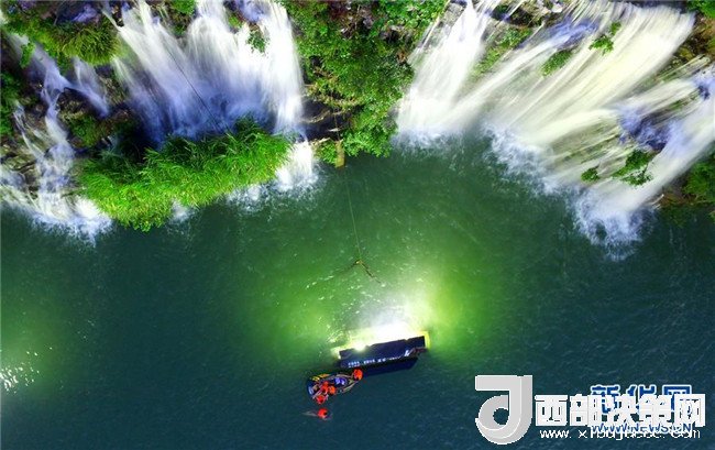 7月18日,市民在廣西柳州市蟠龍山瀑布群下戲水消暑(無人機拍攝)。