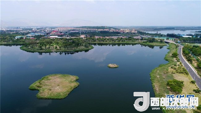 寧夏石嘴山市星海湖及周邊水系貫穿城市(7月31日無人機(jī)拍攝)。 新華社記者 王鵬 攝