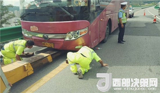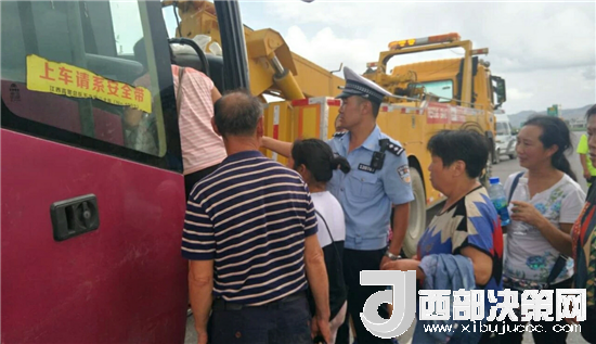 西部決策網(wǎng)-西部大開發(fā)訊(記者帥華鋒 通訊員 馬存福 蘇娟)7月31日上午,甘肅西和縣公安局交警大隊(duì)高速中隊(duì)執(zhí)勤民警巡邏至十天高速西和段上行線天水方向(西和隧道附近),發(fā)現(xiàn)一輛大客車??吭诼愤叄?dāng)時(shí)高速行駛的車輛川流不息,車輛沒有停放在安全地帶,存在著極大的安全隱患。民警上前立即查看情況,發(fā)現(xiàn)車輛故障,67名乘客被困于高速,乘客大多數(shù)為婦女與兒童,由于天氣炎熱,長時(shí)間困于車輛中,情緒焦急不安,存在諸多不安全因素,見此情況,民警立即在故障車輛兩百米外設(shè)置安全提示牌,擺放錐桶,現(xiàn)場指揮過往車輛,提醒車輛減速慢行,做好防護(hù)的同時(shí),利用巡邏警車將車上乘客有序轉(zhuǎn)移到一公里外的停車區(qū),積極聯(lián)系高速公路救援中心將故障車輛進(jìn)行拖移,盡快撤離高速,恢復(fù)交通秩序。
