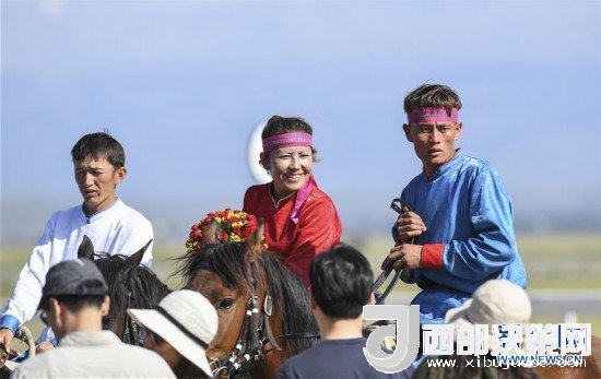 8月1日,在新疆昭蘇縣天馬旅游文化產(chǎn)業(yè)園,肯巴提·買達(dá)力(中)和游客在互動。今年5月,她參加了馬術(shù)表演隊(duì),每月收入2000元左右。新華社記者胡虎虎攝