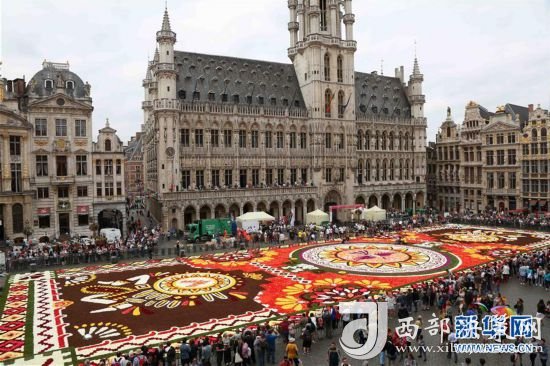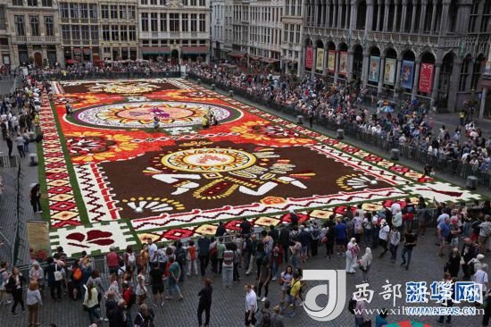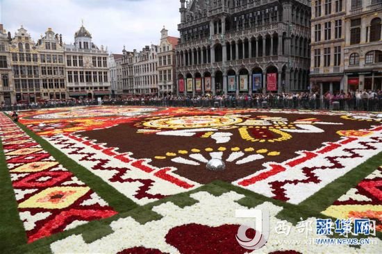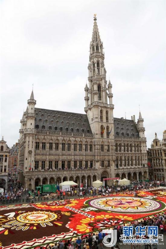 8月16日,由50多萬朵秋海棠鋪就的鮮花地毯亮相比利時布魯塞爾大廣場。 新華社記者王曉郡攝