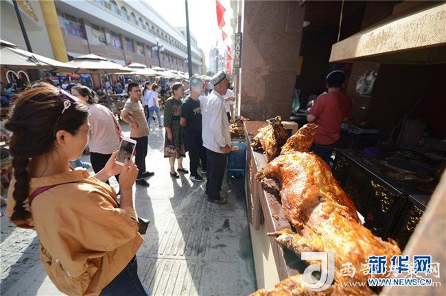 8月18日,游客在烏魯木齊二道橋大巴扎步行街拍攝烤全羊。