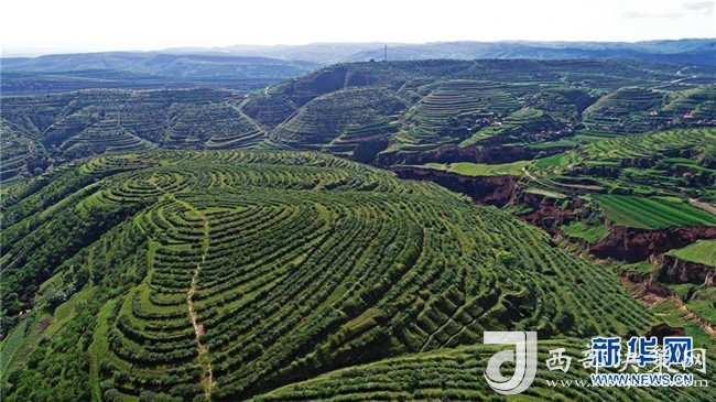 寧夏彭陽(yáng)縣金雞坪梯田公園(7月16日無人機(jī)拍攝)。