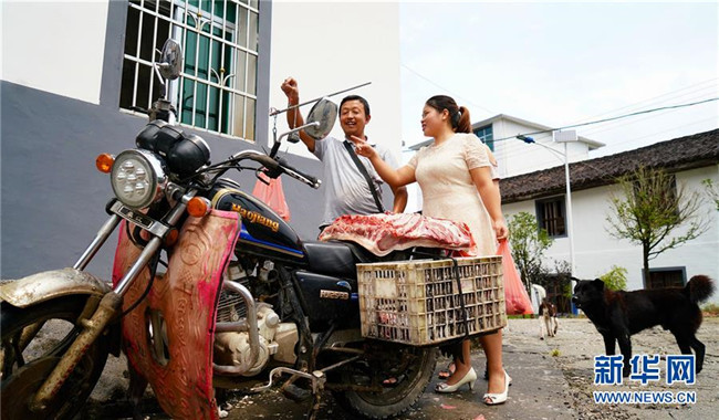 9月4日,陳春英騎摩托車前去領(lǐng)取學(xué)生們的營(yíng)養(yǎng)餐(無(wú)人機(jī)拍攝)。新華社記者胡晨歡 攝