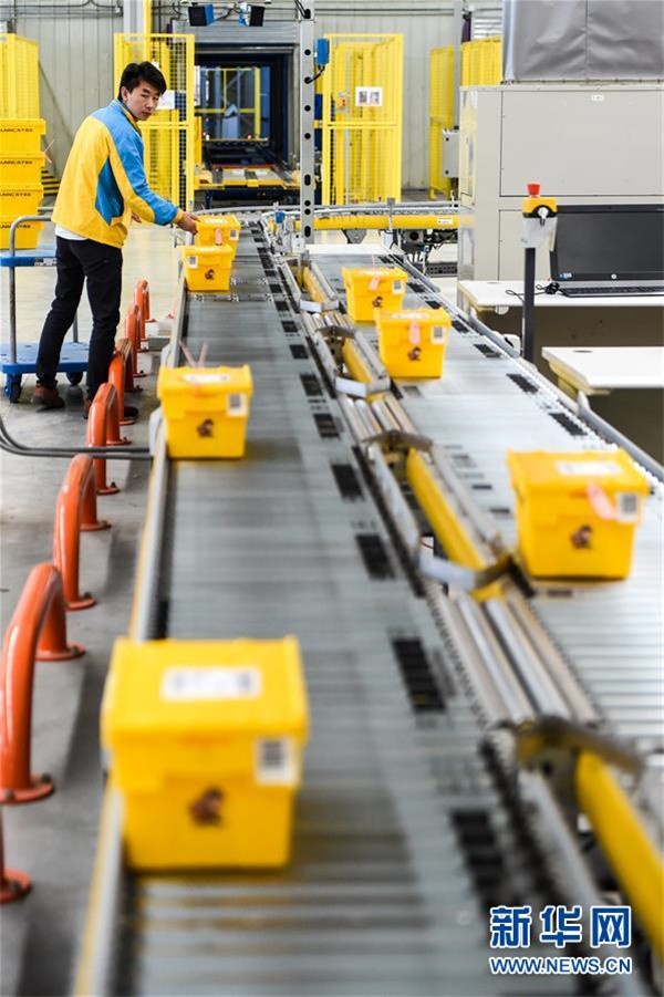 在江蘇南京蘇寧云倉(cāng)物流基地,工作人員將包裝好的“共享快遞盒”放到傳送帶上,準(zhǔn)備進(jìn)行分揀運(yùn)輸(2017年10月31日攝)。新華社記者 李博 攝