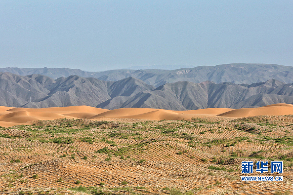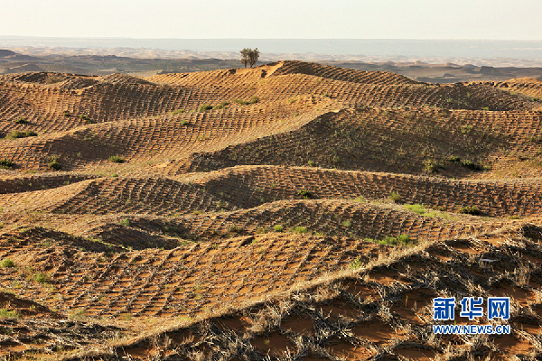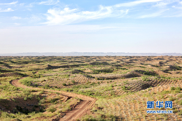通過“麥草方格”模式組成的“沙帳植物帶”。新華網陳延特攝