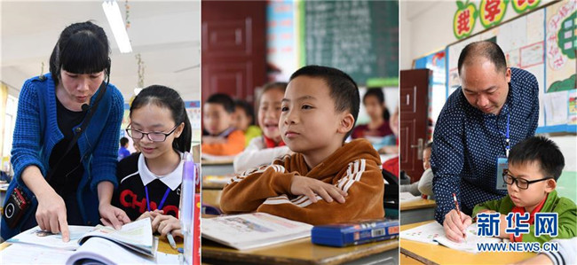 這是一張拼版照片,左圖為:在廣西南寧市馬山縣白山鎮(zhèn)合群初中,溫華芬老師在課后輔導(dǎo)學(xué)生功課(4月10日攝);中圖為:在馬山縣白山鎮(zhèn)同富小學(xué),侯宇宸在聽課(4月10日攝);右圖為:在馬山縣白山鎮(zhèn)同富小學(xué),侯瑞良老師在輔導(dǎo)學(xué)生功課(4月10日攝)。2017年9月,廣東茂名選派優(yōu)秀教師到廣西馬山縣支教。茂名市電白區(qū)木蘇中學(xué)老師溫華芬得知后,與在電白區(qū)陳村中學(xué)任教的丈夫侯瑞良積極響應(yīng),決定帶上9歲的兒子侯宇宸共同來(lái)到馬山縣,開展為期一年的支教活動(dòng)。新華社記者 陸波岸 攝