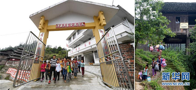 這是一張拼版圖片,左圖為2017年11月17日,廣西三江侗族自治縣洋溪鄉(xiāng)安馬小學(xué)寨全教學(xué)點(diǎn)教師吳周成和學(xué)生們走出學(xué)校;右圖為2014年6月10日,黃開亮在位于吊腳樓里的教學(xué)點(diǎn)目送學(xué)生離校。作為該教學(xué)點(diǎn)的一名老師,黃開亮在這座三面透風(fēng)的吊腳樓里堅(jiān)守了30年。2014年,師生們搬進(jìn)了三層高的新教學(xué)樓;而黃開亮的學(xué)生、“95后”小伙吳周成也回到學(xué)校,以支教老師的身份傳承老班主任的奉獻(xiàn)精神。新華社發(fā)(黎寒池 攝)