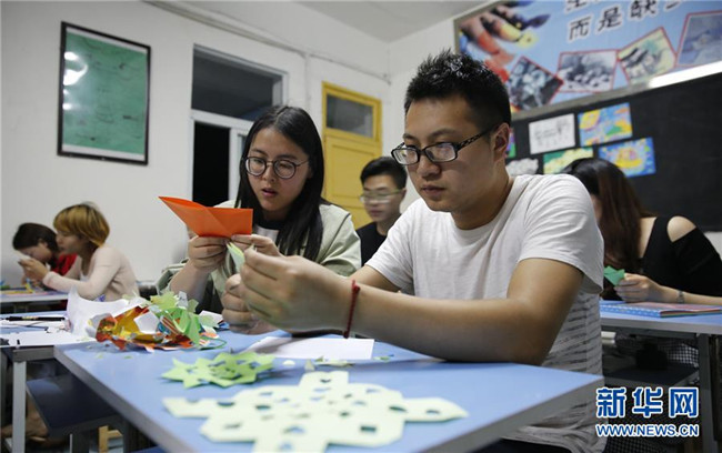 四川省華鎣市慶合初級(jí)中學(xué)教師王俊又(右一)與許玉玲在練習(xí)剪紙(4月17日攝)。慶合初級(jí)中學(xué)位于華鎣山腳下,由于距離縣城較遠(yuǎn),該校大部分教師長(zhǎng)期“以校為家”。