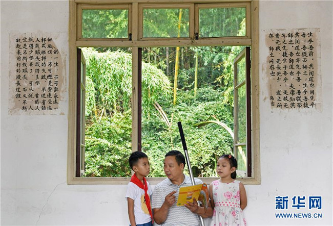 在江西南昌灣里區(qū)立新村立新學(xué)校,鄉(xiāng)村教師高自仁在課間休息時(shí)給學(xué)生講解科學(xué)知識(shí)(9月3日攝)。因患小兒麻痹左腿行動(dòng)不便的高自仁1977年高中畢業(yè)后回到老家,在位于梅嶺大山深處的山村里做一名教師。41年來(lái),高自仁拄著拐杖跋涉在崎嶇山路,堅(jiān)守在三尺講臺(tái),培養(yǎng)了一批又一批學(xué)生,幫助他們走出大山。新華社記者 萬(wàn)象 攝