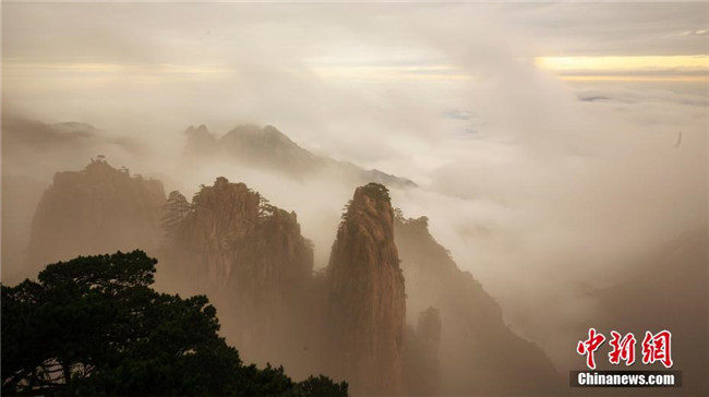 9月17日,秋雨洗禮后的安徽黃山風(fēng)景區(qū)霧氣繚繞,秋風(fēng)清爽。遠處千峰疊嶂,互相競秀,千谷萬壑,云煙升騰。陣陣秋風(fēng),吹拂著云霧淡淡濃濃,天都峰、蓮花峰及西海群峰藏在其間,若隱若現(xiàn),幻若仙境。 葉永清 攝