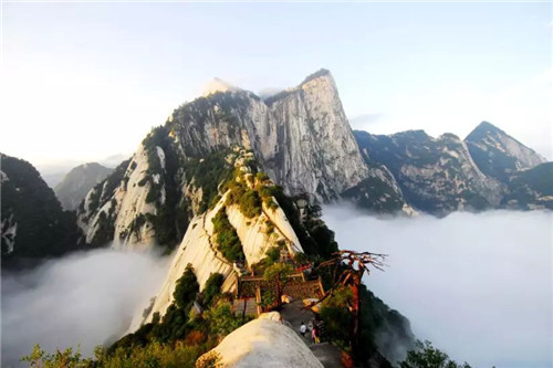 漫步于華山的峰嶺山道,到處可以看到許多與云有關(guān)的景點(diǎn),也能從與云有關(guān)的神奇?zhèn)髡f(shuō)中,感受到宛若仙境的景象。五云峰是華山諸峰中最富有詩(shī)情畫(huà)意的一座峰嶺。每逢深秋季節(jié),松翠楓赤,山花耀目,在太陽(yáng)光的照射下,猶如五色彩云,霓裳般妝扮了山的容顏。在這里,松楓山花都成了五彩云霧。而位于云臺(tái)峰以北的白云峰,山峰的若石就如白云一樣漂浮在空中。傳說(shuō)漢元帝劉爽的女兒南陽(yáng)公主為避離亂之苦,遠(yuǎn)離塵露,就到白云峰隱居修行,修煉功成,駕鶴乘云而去。