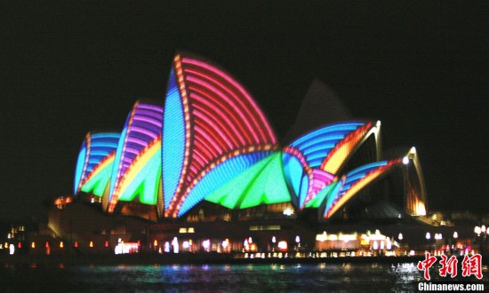 資料圖:澳大利亞的著名標志性建筑悉尼歌劇院在燈光的裝飾下,夢幻迷人,五彩奪目。中新社發(fā) 沙長華 攝