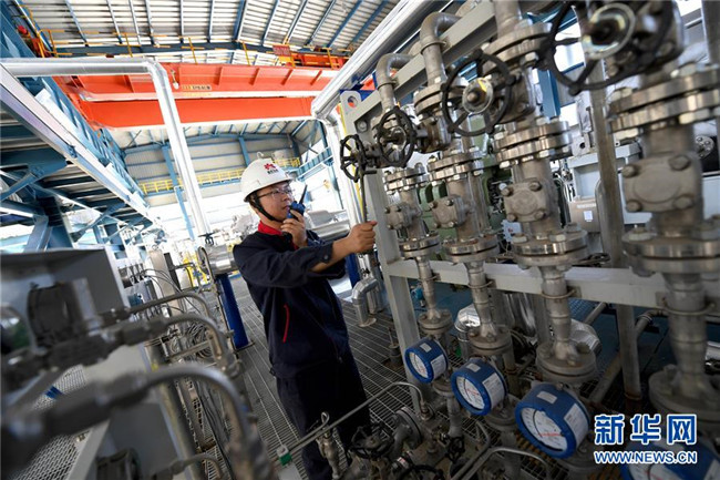 延安煤油氣資源綜合利用項(xiàng)目甲醇制烯烴中心的工作人員在進(jìn)行設(shè)備巡檢(9月28日攝)。新華社記者 劉瀟 攝