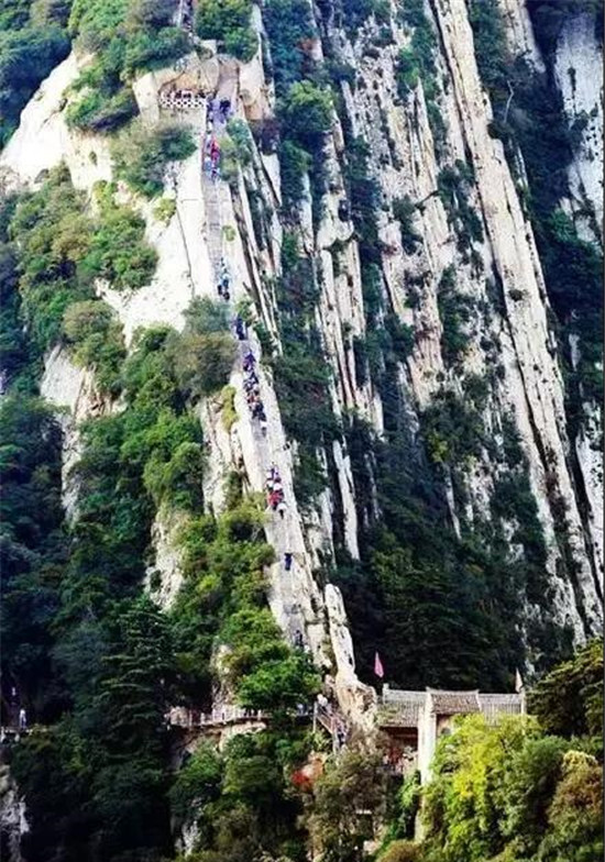 千尺幢:一條陡峭的鳥道從懸崖穿過,僅能容兩人上下,坡度成一條垂直的線,372個臺階向天而上,就像一頭瘦骨嶙峋的老牛的肋骨,承載了數(shù)不清游人沉重的腳步。弓著身子努力向上攀爬的時候,雙手使勁拉住了旁邊的鐵鏈,嘩啦嘩啦的聲音始終在千尺幢這里回響著,除去鐵鏈的聲響,這條鳥道充滿的是小心翼翼的安靜,偶爾有人喊一聲,也是脫口而出的叮嚀和提醒。