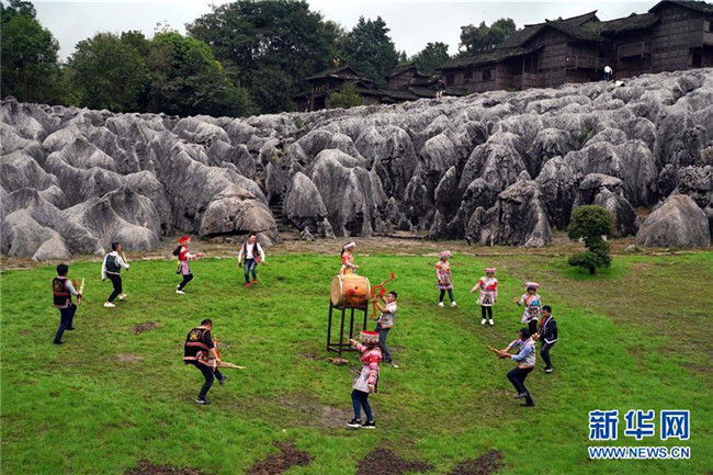10月14日,工作人員在興文石海世界地質公園內表演苗族花山節(jié)節(jié)目。