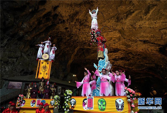 10月14日,表演者在興文石海世界地質公園的溶洞內表演國家級非物質文化遺產“大壩高裝”。