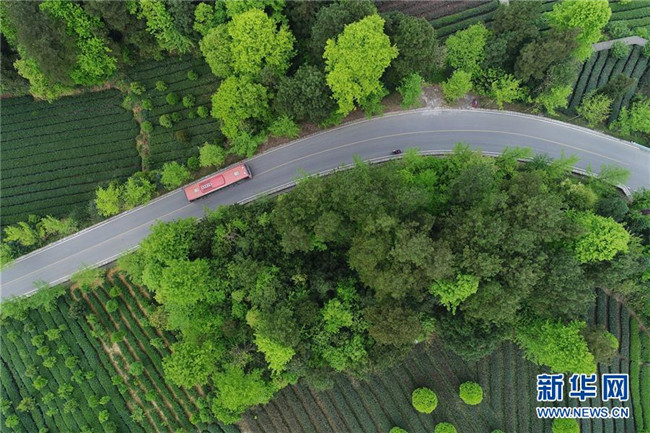 汽車在貴州省遵義市湄潭縣金花村內(nèi)的道路上行駛(4月12日無人機拍攝)。 新華社記者 歐東衢 攝