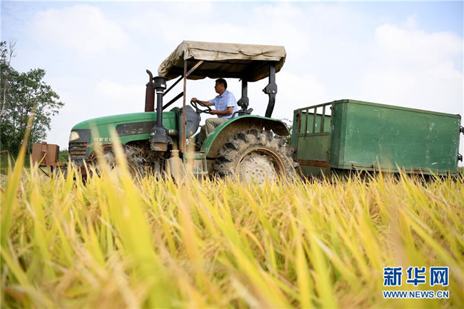 安徽省肥西縣山南鎮(zhèn)小井莊村種糧大戶陳良玉駕駛拖拉機運送剛收割的水稻(9月12日攝)。 新華社記者 劉軍喜 攝