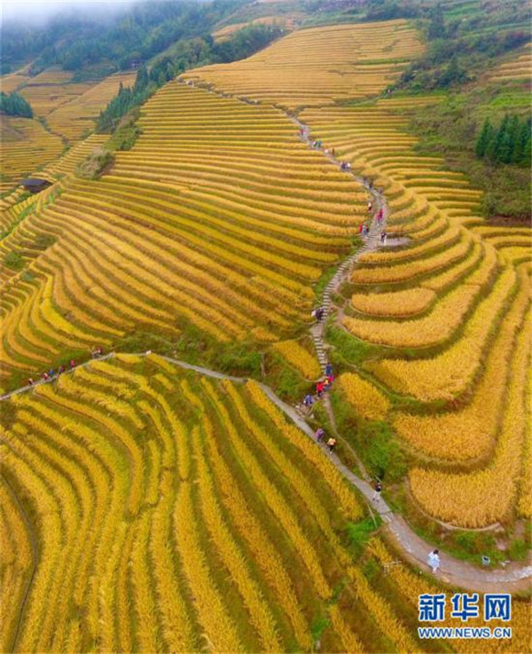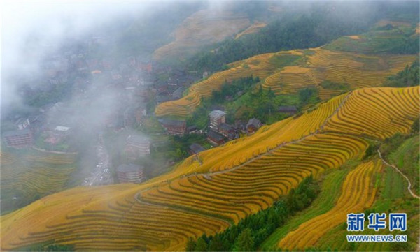 10月16日,游客在秋雨中欣賞龍脊梯田秋色(無人機拍攝)。金秋時節(jié),廣西龍勝各族自治縣龍脊梯田美如畫卷。 新華社記者 黃孝邦 攝