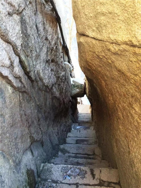 過千尺幢向北折即到"百尺峽",它是登華山的第二個(gè)險(xiǎn)境。峽的兩壁欲合,卻被飛來的兩顆石塊從中撐開,人從石頭下鉆過,膽戰(zhàn)心驚,生怕石塊從兩壁間掉下來,這就是"驚心石"。通過此石懸著的心才放下來,再回頭看原來此處卡著的兩塊石頭,是上大下小故能安然無恙,所以這顆石頭也被稱之為"平心石"。故韓愈詩中有"俄然神功就,殺氣見棱角"的描寫。