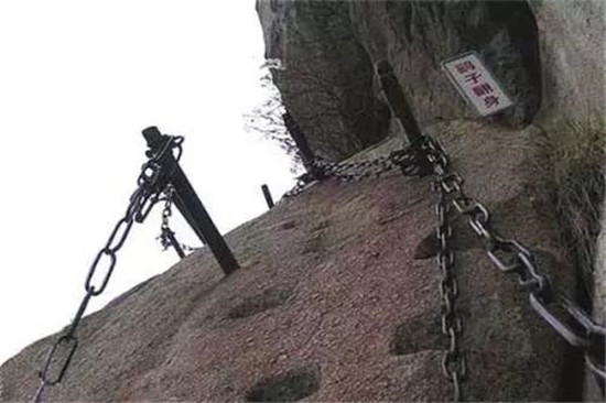 在南天門外,是華山著名險(xiǎn)道之首“長(zhǎng)空棧道”。棧道路分三段,出南天門石坊至朝元洞西,路依崖鑿出,長(zhǎng)20米,寬二尺許,是上段;折向下行,在崖隙間橫貫有鐵棍,形如凌空懸梯,游人須挽索逐級(jí)而下,稱之“雞下架”,是中段;西折為下段,筑路者在峭壁上鑿出石孔,楔進(jìn)石樁,石樁之間架木椽三根,游人至此,面壁貼腹,腳踏木椽橫向移動(dòng)前行。這里只是探險(xiǎn)之道,并非登山必由之路,膽小的游客觀望一下即可,體力和膽量沒有把握則不要輕易冒險(xiǎn)。所以石刻上不少警告之語,如“懸崖勒馬”等。