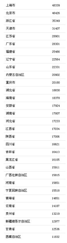 前三季度收入榜:上海48339元最高