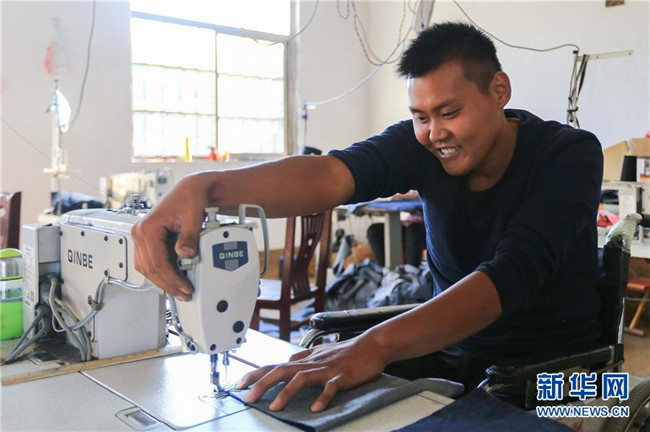 在山東蘭陵縣礦坑鎮(zhèn)朱柳屯村的扶貧車間,貧困戶范加誠操作縫紉機加工布料(10月10日攝)。今年29歲的范加誠八年前在建筑工地打零工時被因意外造成高位截癱。2016年,5萬元扶貧貸款為范加誠扶貧車間建設(shè)送來“及時雨”。一個月的時間,他就有了寬敞明亮的加工車間和8臺嶄新的縫紉機。新華社記者 王南 攝