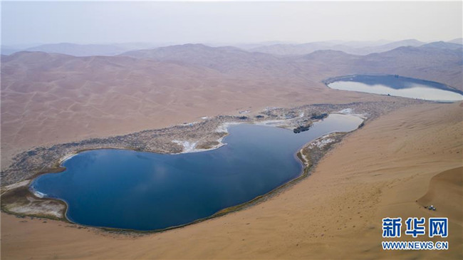 巴丹吉林沙漠中的湖泊,仿佛一顆落在沙中的寶石(10月18日無人機(jī)拍攝)。 巴丹吉林沙漠位于內(nèi)蒙古西部阿拉善盟,是中國第三大沙漠,沙丘起伏的曲線陡變成高聳的沙山,碧藍(lán)的湖泊散落在沙海間。 新華社記者 達(dá)日罕 攝