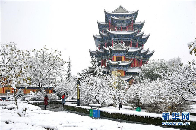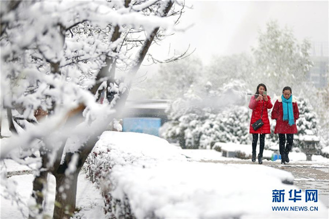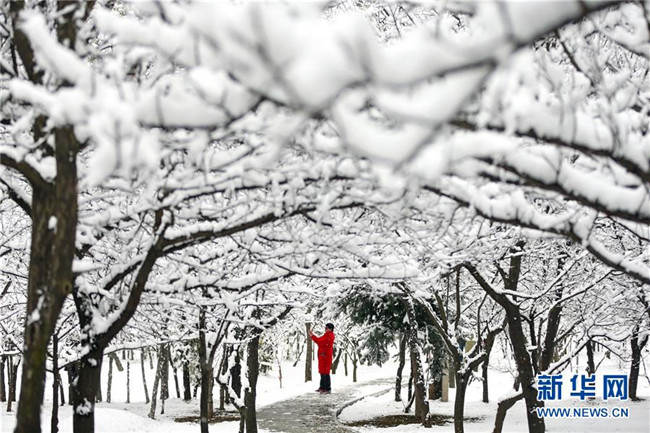 當日,甘肅省平涼市出現降雪天氣,銀裝素裹的冰雪世界吸引市民前來欣賞雪景。新華社發(fā)(楊昕 攝)