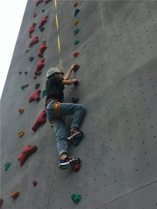 換上攀巖鞋、穿好安全帶,帶好安全帽,抓緊手窩踩實(shí)腳窩,手腳并用的攀上巖壁……如果不慎踏空,那就有可能飛身而下,攀巖者可從頭再來。