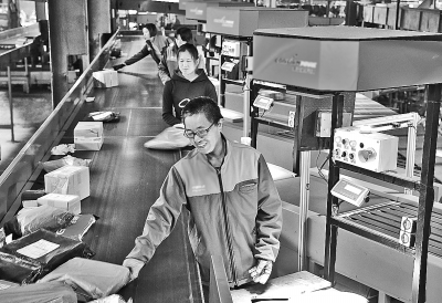 11月11日,工作人員在江蘇省南通市一家快遞公司分揀系統(tǒng)旁忙碌。國(guó)家郵政局預(yù)計(jì),今年“雙11”期間,全行業(yè)處理的郵件、快件業(yè)務(wù)量有望超過18.7億件,最高日處理量是平日的3倍。新華社發(fā)(許叢軍攝)
