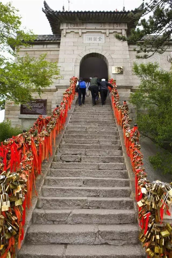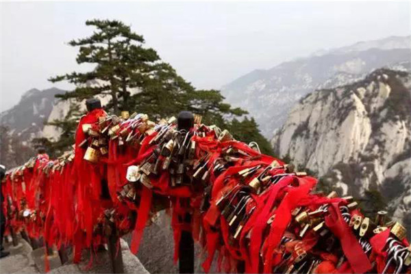 金鎖關(guān)北接五云峰,南控華山主峰,東西兩側(cè)壑深千丈,關(guān)前僅有一米完的臺階石徑。環(huán)周古松蒼翠,奇石林立,常有祥云環(huán)繞,風(fēng)光非常迤麗。“但有女兒初長成,便為三秦姣姣容。”說的就是奇險天下第一山的華山除了以其奇、險、秀而聞名遐邇之外,還別有一番令人動容的金鎖關(guān)風(fēng)景:關(guān)內(nèi)、關(guān)外登山路兩側(cè)的鐵索上,情侶鎖、平安鎖,重重疊疊,紅繩彩線迎風(fēng)搖曳,筑成一道美麗的愛情風(fēng)景線,鎖住對愛情的誓言,表達(dá)堅(jiān)如磐石的愛情忠貞!