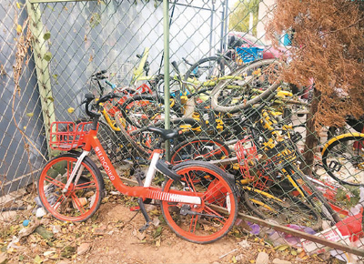 圖為廢棄的共享單車。本報(bào)記者 彭訓(xùn)文攝 |