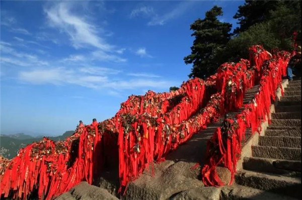 華山是愛(ài)情山,“洞房”一詞就源于華山西峰。相傳春秋時(shí)期在華山修行的吹簫人簫史和秦穆公的女兒弄玉就是在華山西峰相識(shí)相愛(ài),由于山上沒(méi)有房屋,就在崖壁上鑿洞成婚,“洞房”一詞由此誕生。 如今來(lái)愛(ài)情山的游客都有了一個(gè)約定俗成的習(xí)慣,“進(jìn)山先拜廟,相愛(ài)神知道”,“一把連心鎖,鎖定你和我”。相愛(ài)的情侶,不分年齡,不分國(guó)籍,不分信仰,來(lái)到山上都要進(jìn)香上鎖,讓華山見(jiàn)證彼此的真心與愛(ài)意,祈求幸福美滿,人生甜蜜。